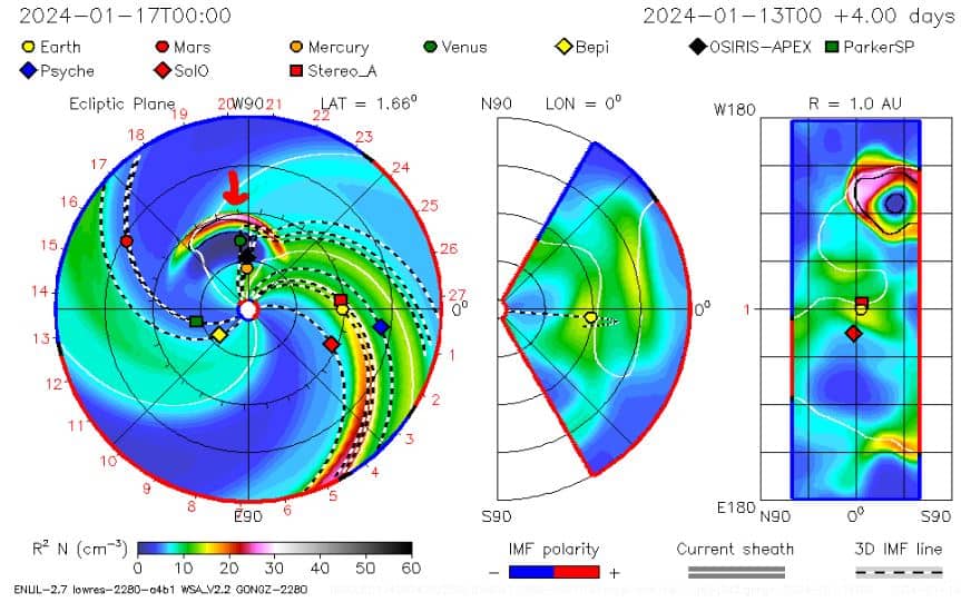 Afb: Dit is een ander vooruitzicht voor de zonnewind. Deze laat de zonnevlammen zien en wat de verwachting is hoe de golven zonnestorm door het zonnestelsel heel bewegen. We zien dat dinsdag 16-1 en woensdag 17-1 Mercurius en Venus de volle laag krijgen van een zonnestorm (zie rode pijl).