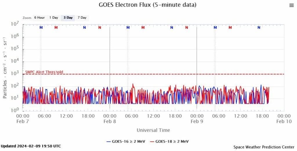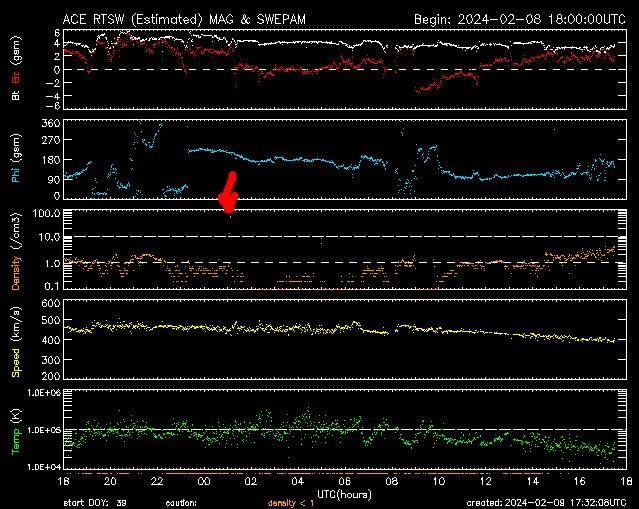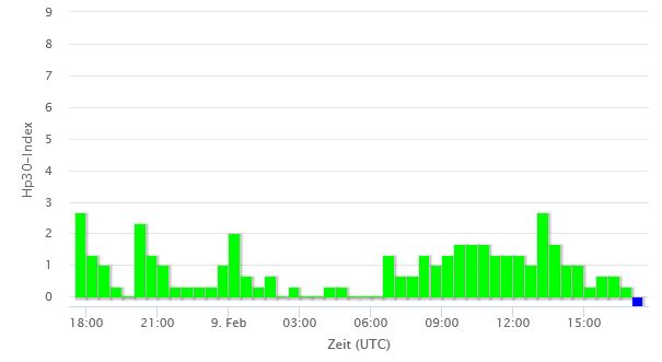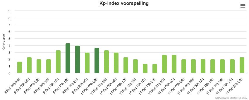 De zonnewind snelheid was mild verhoogd rond 10:00 uur ongeveer 500 km/sec. dat is een zeer milde verhoging en er was dan ook geen reactie van de beschermende magnetosfeer. De verwachting voor de komende dagen is dat het rustig blijft met de zonnewind/zonnestormen. Mogelijk is er zondag een verhoogde zonnewind of zonnestorm van de grote uitbarsting van vrijdagmiddag 9-2 op de rand van de Zon, maar waarschijnlijk gaat deze zonnestorm de aarde niet raken.