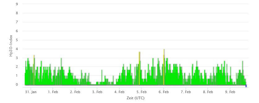 Afb: dit is de weergave van de Kp-index en dat is de reactie van de beschermende magnetosfeer van de aarde op zonnewind en andere kosmische invloeden.