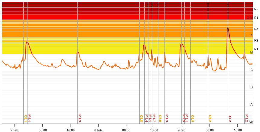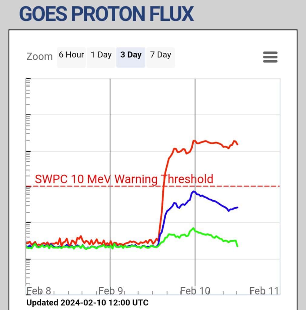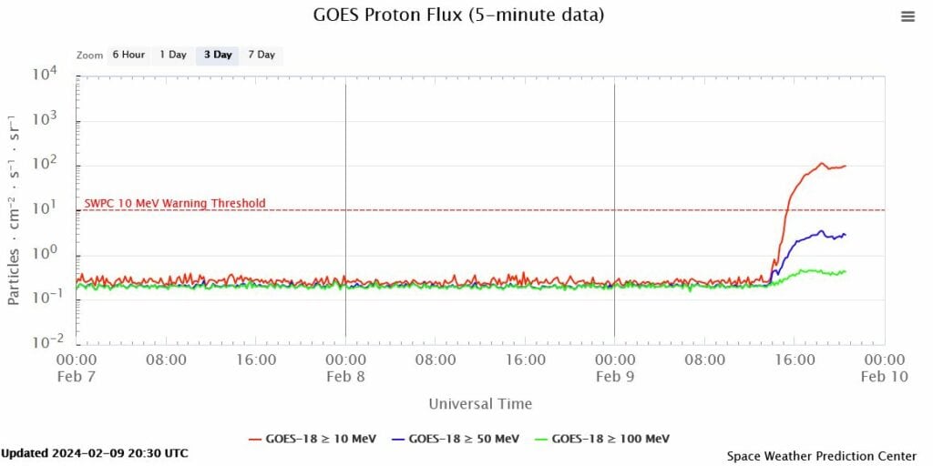 Afb: De nieuwe protonenstorm die begon rond 15:00 uur op vrijdag 9-2 door een grote zonnevlam vanaf de rand van de Zon.