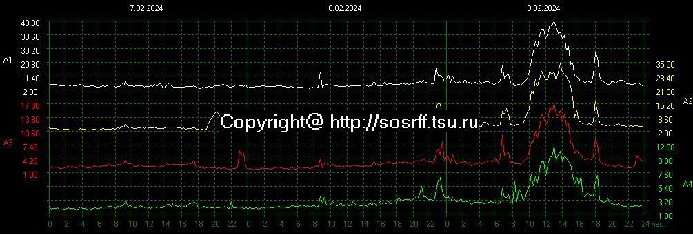 KORTE UITLEG ACTUELE SITUATIE: De Schumannresonantie is actief tussen 4:00 en 10:00 uur, met de hoogste piek rond 7:00 uur met een hoge activiteit van 49 amplitude. Omdat er ook andere verstoringen waren (C-klasse zonnevlammen en X-ray pieken) was deze verstoring zeker goed voelbaar. (Deze activiteit is gedeeltelijk en dus niet full spectrum.)