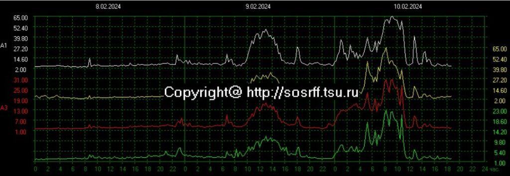 Afb: dit zijn de Schumannresonantie amplitude en geeft de intensiteit aan van de SR activiteit en metingen zijn gedaan in Rusland. De tijd is Minsk en dus minus 6 uur om onze tijd te zien.