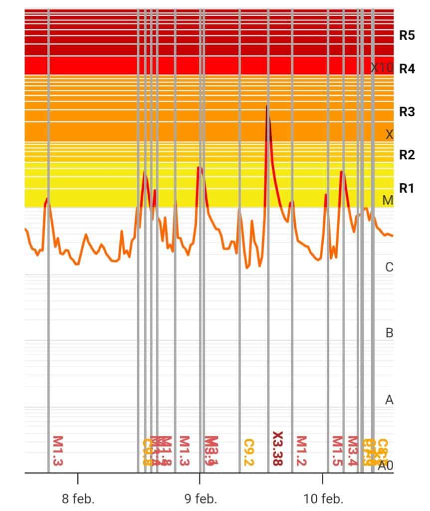 KORTE UITLEG ACTUELE SITUATIE ZONNEVLAMMEN: 1,5 week geleden (ma 29-1) was er een uitbarsting op de Zon vanaf de rand van de Zon met CME, een hoge zonnevlam dus (M-6.8) die een protonenstorm triggerde, zo hoog, dat die er een week over deed om weer op normaal niveau te komen. Lees de uitleg over wat een protonenstorm kan veroorzaken in de alinea hieronder. Een hoge protonenstorm is bijzonder uitputtend, zeker als dat een week aanhoudt. Zo’n zeer hoge zonnevlam, zelfs veel hoger dan de vorige zonnevlam van 29-1. Het is nu een X-3.38 vanaf de rand van de Zon met CME en werd rond 14:10 uur gemeten. En deze stuurde plasma onze kant op met veel protonen. Rond 15:00 uur begonnen de protonen op te lopen naar een hoge protonenstorm level. Je mag er wel vanuit gaan dat dit de hele week gaat duren voordat de protonen weer op normaal niveau is. Ook krijgen we mogelijk over 1,5/2 dagen een milde zonnestorm hier op aarde. Al hoewel de modellen de van de experts laten zien dat deze zonnestorm waarschijnlijk de aarde zal gaan missen.