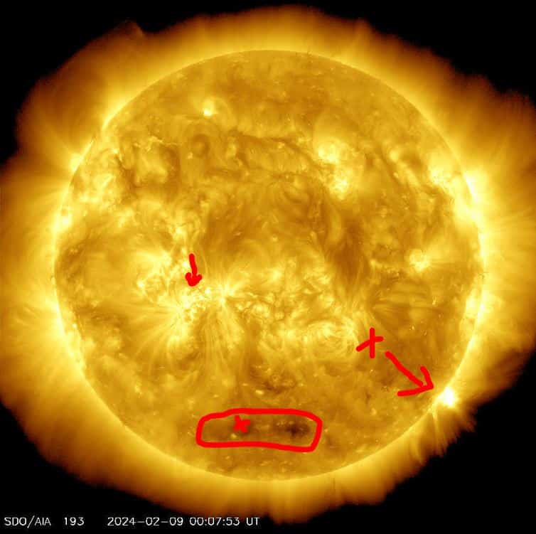 Afb: dit is de Zon gezien vanaf de aarde vrijdag 9-2 De rode pijl met het kruisje erbij is de zonnevlek die de hoge X-klasse zonnevlam produceerde met CME. De ovaal met het kruisje erin, dat is het gat in de corona van de Zon. Die was niet ingetekend door de specialisten, dus die heb ik er zelf even ingezet.