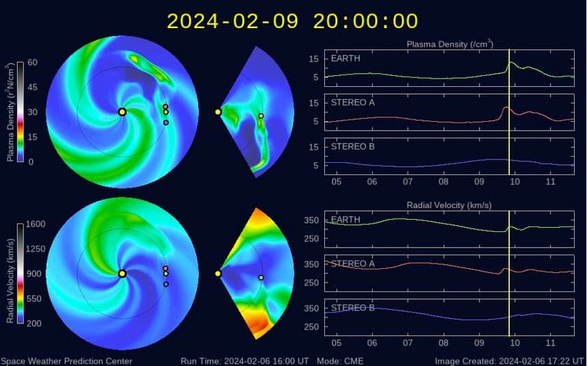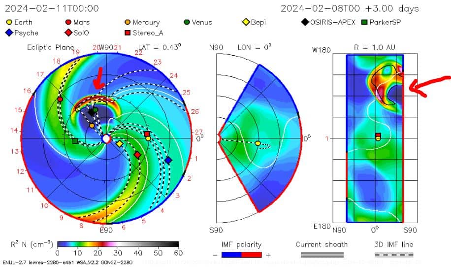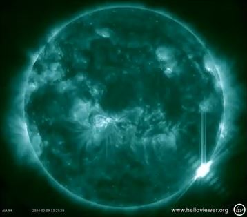 Afb: Deze weergave laat zien dat de hele grote zonnevlam van vrijdag 9-2 rond 14:10 uur (zie rode pijlen), de aarde waarschijnlijk gaat missen en er dus geen zonnestorm of verhoogde zonnewind zal komen.