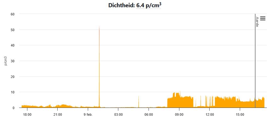 Afb: Dit is een weergave van zonnewind dichtheid, die rond 2:00 uur een hoge pieken liet zien van rond de 53 p/cm3. in deze weergave/meting. De andere grafiek van de ACE satelliet laat zien dat de pieken nog hoger waren, rond 70 p/cm3.