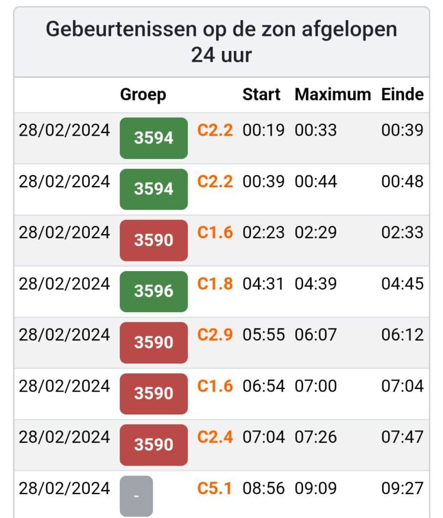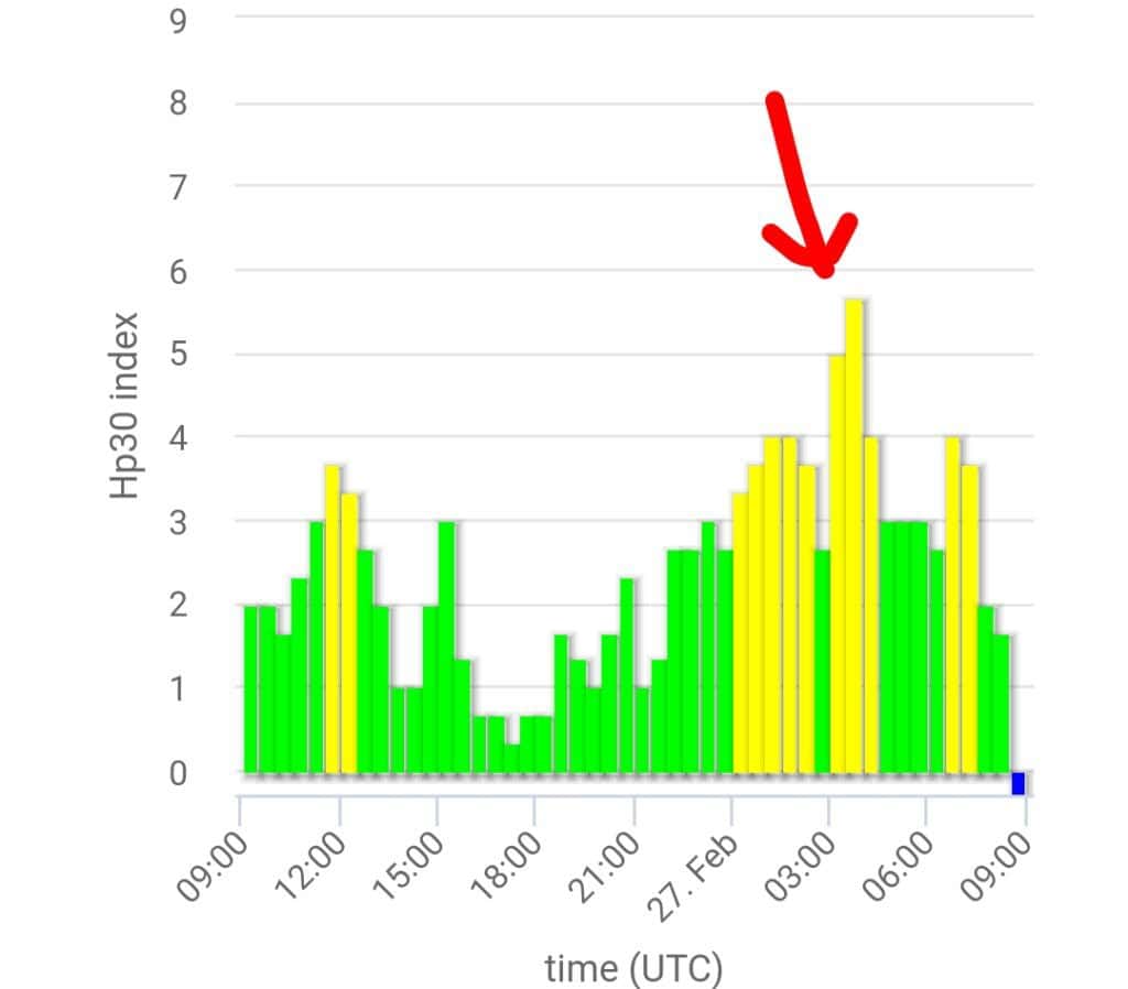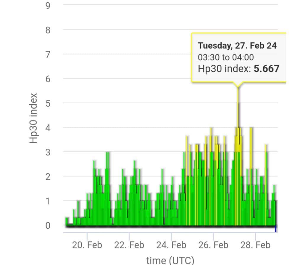 Er was op dinsdag 27-2 tussen 2:00 en 8:00 uur en ook nog tussen 19:00 en 20:00 uur een reactie van de beschermde magnetosfeer van de aarde met een situatie tegen zonnestorm aan. Met heel kort tussen 4:30 en 5:00 uur een flink hoge piek tegen kp-6 aan. En
