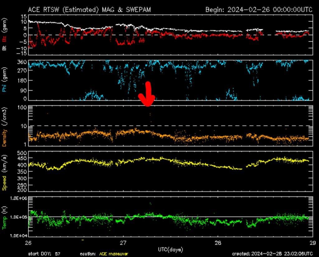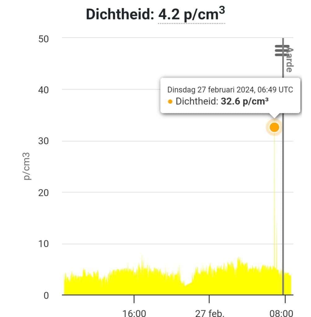 Er waren gemiddelde X-ray pieken rond 8:00 uur op dinsdag 27-2 van rond de 33 p/cm³. Deze werden zichtbaar op meerdere metingen in de zonnewind dichtheid.
