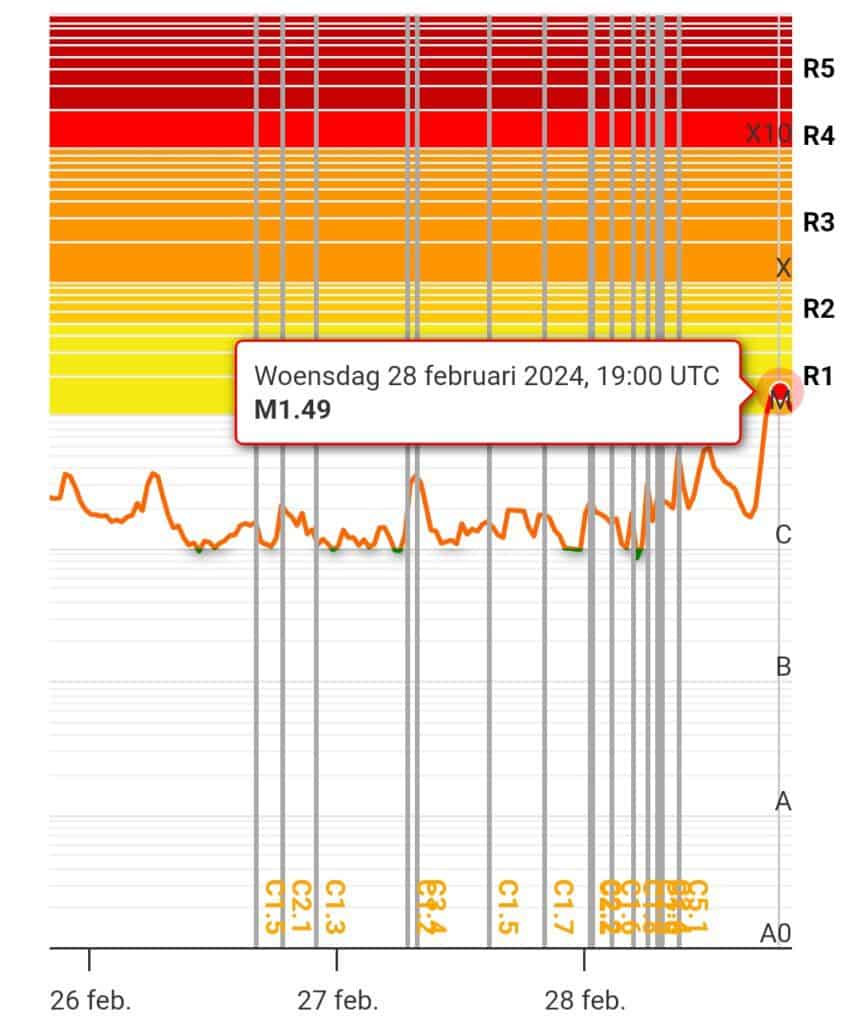 De super grote zonnevlek AR3590 die afgelopen week op de aarde gericht stond produceerde zondag 25-2 rond 18:10 uur de vorige M-klasse zonnevlam M-2.05. En pas op deze woensdag weer opnieuw een M-klasse zonnevlam M-1.49 rond 20:00 uur. Die rust van 3 dagen was best opmerkelijk, want er was een pittige hoge verwachting van deze zonnevlek met potentieel zeer hoge zonnevlammen, omdat de zonnevlek zo enorm groot is. Nu staat de zonnevlek op de rand van de Zon en zaterdag uit het zicht naar de achterkant van de Zon verdwijnen. Op de rand van de Zon zijn de zonnevlekken weer extra actief en dus is het extra waarschijnlijk dat er donderdag en vrijdag weer hogere zonnevlammen zullen zijn.