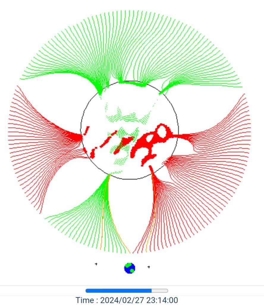 De magnetische verbinding tussen aarde en Zon is woensdag rond middernacht (00:00 uur) weer geswitcht naar de ‘ongewone’ magnetische verbinding (groene stralen). De verwachting is dat dit ongeveer 5 dagen aan de orde blijft. Daarna is er zeer waarschijnlijk weer een switch naar de ‘normale’ verbinding.