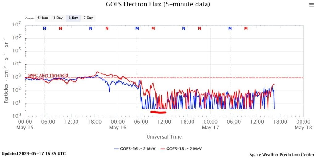 Afb: de magnetische switch van de magnetische verbinding van de aarde met de Zon is al weer opnieuw aan de orde vanaf vrijdag 17-5 vanaf middernacht, dus 00:00 uur. Vanaf dat moment was plotseling weer de switch naar de ‘ongewone’ magnetische verbinding tussen aarde en Zon (HCC) (UTC is +2 uur voor onze tijd.) Deze plotselinge switch is waarschijnlijk te danken aan de zeer grote zonnevlek die net in het zicht van de aarde is gedraaid en die woensdag die grote X-klasse zonnevlammen produceerde. Dus dat is echt wel een super monster die nu even rustig is op vrijdag. We gaan zien wat er verder komt. Ik verwacht dat deze milde verstoring HCC aan de orde is tot ongeveer woensdag 22-5.
