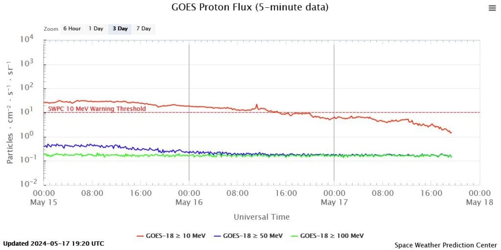 UITLEG ACTUELE SITUATIE: Vrijdag 10-5 begon de protonenstorm en die is bijna de hele tijd actief geweest, door steeds nieuwe zonnevlammen (CME’s). Op donderdag 16-5 vanaf 22:00 uur kwamen de protonen onder stormlevel, maar nog steeds tegen protonenstorm aan. Dus dat kan je mogelijk nog steeds voelen met grove deeltjes die door je heen razen of anders symptomen, zoals een overbelast zenuwstelsel of juist opgetild worden door de hoge lichtfrequentie. De verwachting is dat het nog een dag of 4 of 5 gaat duren voordat de protonen weer op normale waarde zijn. Dus dinsdag 21 of woensdag 22 mei, verwacht ik. Mogelijk kunnen er nog nieuwe CME’s komen, omdat er nog een paar zonnevlammen op de aarde gericht staan, maar die kans is gemiddeld en niet super hoog.