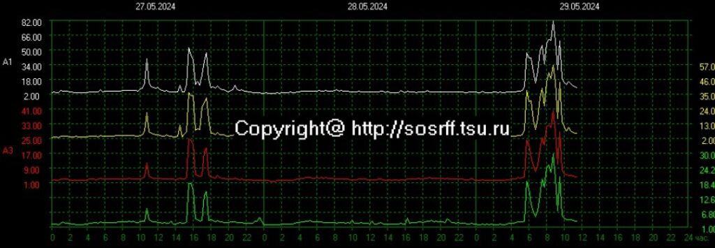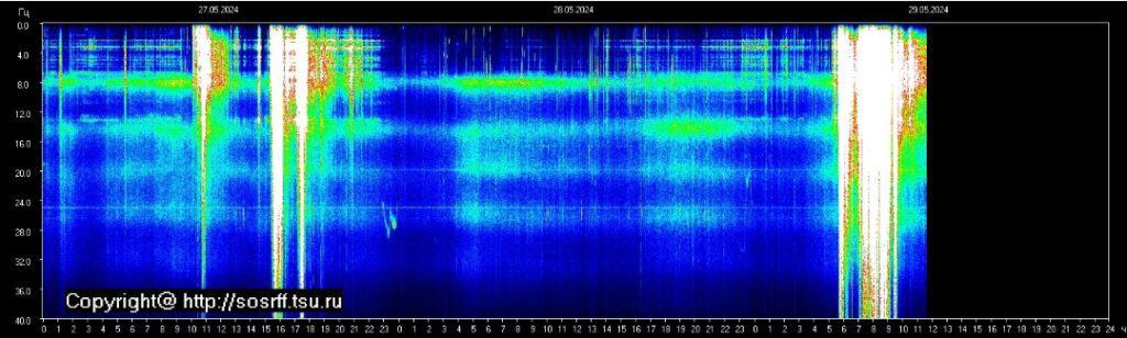 Afb: dit zijn de Schumannresonantie ELF metingen, gemaakt in Rusland. De tijd is Minsk en dus minus 7 uur om onze tijd te zien.