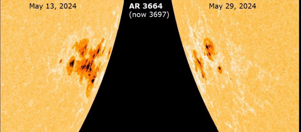 Afb: De zonnevlek is veel minder groot nu die terugkeerd en dus is de verwachting milder met alleen M-klasse zonnevlammen.