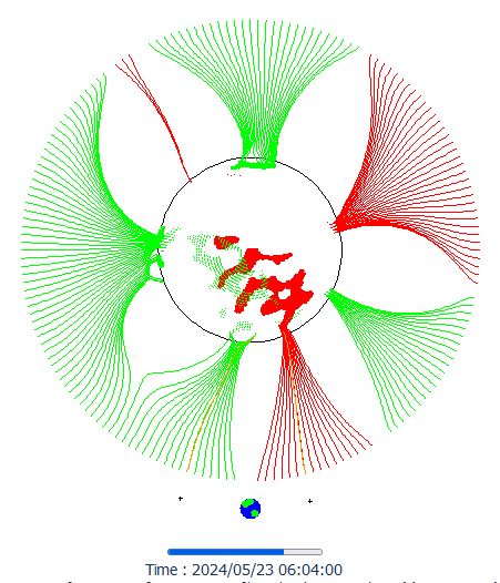Afb: de magnetische switch van de magnetische verbinding van de aarde met de Zon is al weer opnieuw aan de orde vanaf donderdag 23-5 vanaf 8:00 uur is de magnetische verbinding tussen aarde en Zon los en er is nog geen nieuwe magnetische verbinding gevonden met de Heliospheric Currentsheet. Dus dat kan betekenen dat je de aarde verbinding als anders ervaart. Ik update hier later als de verbinding er weer is en welke verbinding (rood of groene stralen, want het is zeer instabiel op het moment).