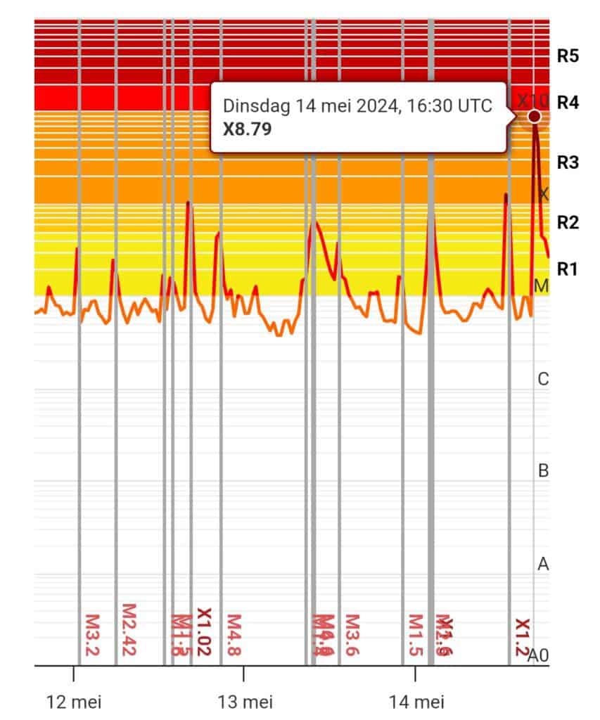 Afb: dit is de weergave van X-ray zonnevlammen. Er waren extreem hoge zonnevlammen dinsdagmiddag.
