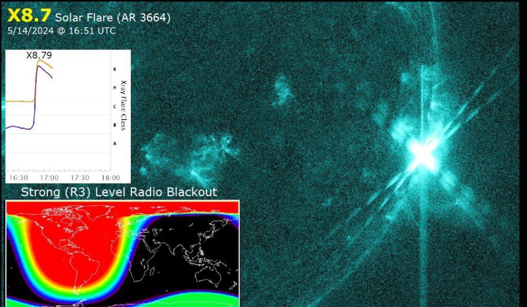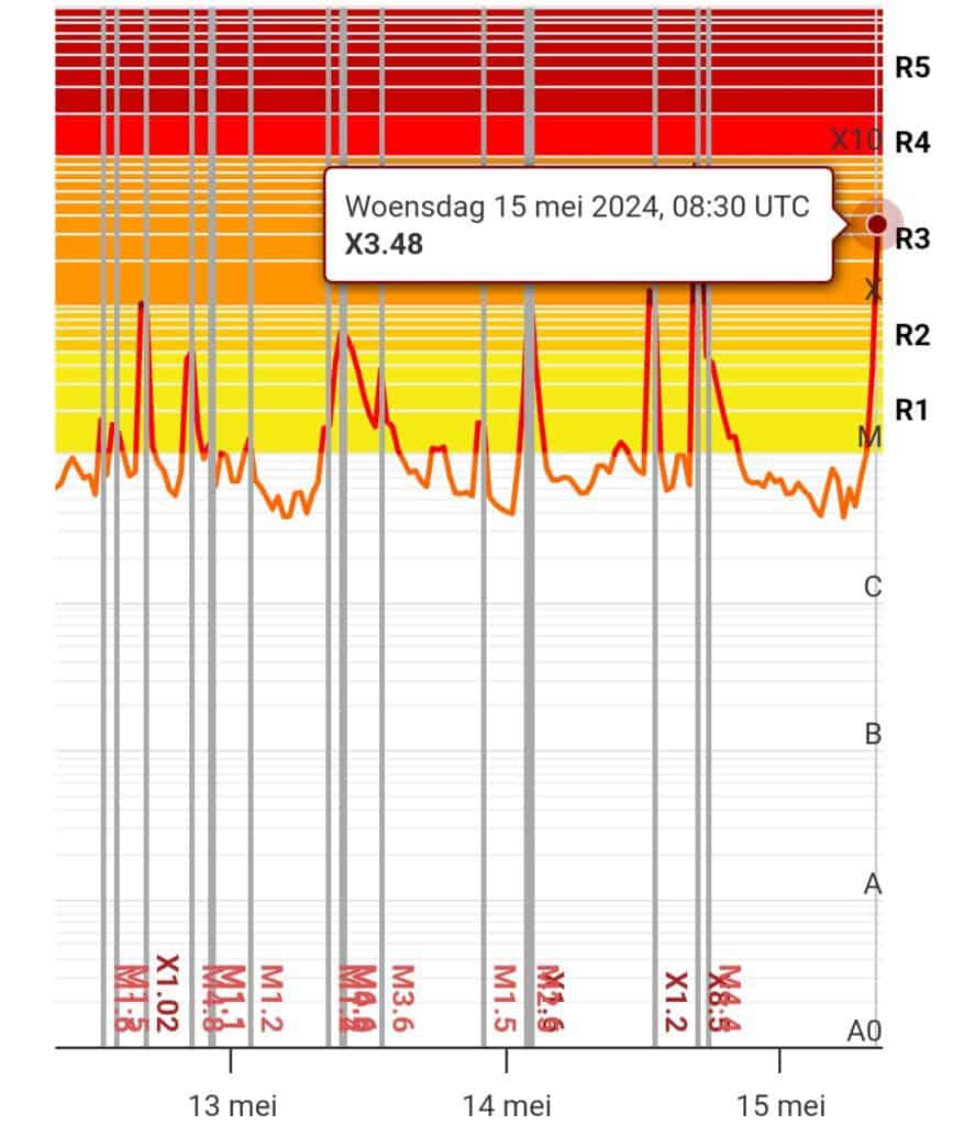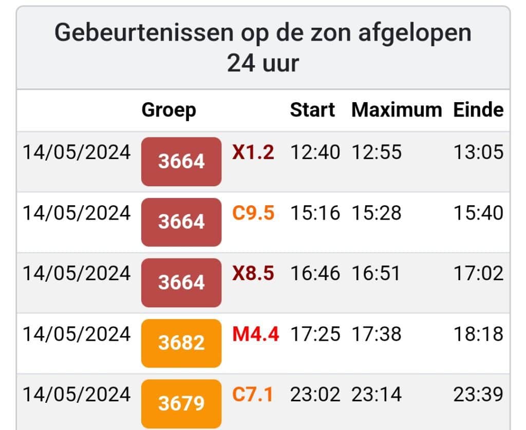 UPDATE WOENSDAGOCHTEND 15-5: Opnieuw een hoge zonnevlam X-3.48, zeer waarschijnlijk weer vanaf de rand van Zon van dezelfde zonnevlek die alle ophef veroorzaakte afgelopen week. Er was bijna tegelijkertijd toen die super hoge zonnevlam dinsdagavond er was, ook een mega ontploffing aan de andere zijkant van de Zon (zie afbeelding zonnevlam). Dus dat betekent dat er een nieuwe super grote zonnevlam richting de aarde in het zicht gaat komen. Dus dan blijft het onrustig. We gaan het zien. Er was dinsdag tussen 10:00 en woensdagochtend 7:00 uur gedeeltelijke Schumannresonantie activiteit, met de hoogste intensiteit rond 00:00 uur met een amplitude van 66 en dat is super hoog. De SR versterkt alles wat er al aangeraakt is en dus ook de verstoringen van de Zon worden intenser voelbaar. Ik heb de nieuwe grafieken en informatie hieronder erbij gezet. (EINDE UPDATE)