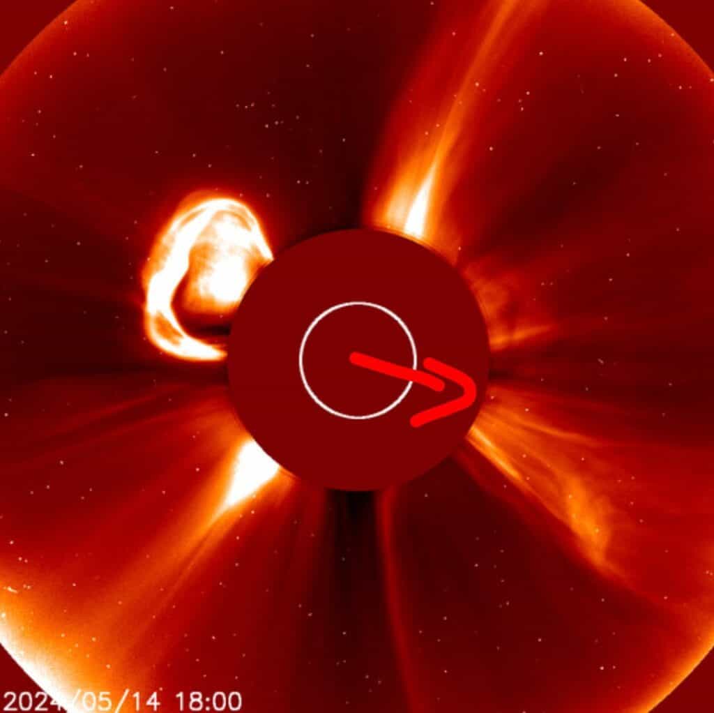 Afb: Dit is de super grote zonnevlam van dinsdagavond, daar waar de rode pijl staat. Je ziet aan de andere rand van de Zon ook een mega explosie, die nog aan de achterkant/zijkant van de Zon is. Dus er komt nog meer aan met hoge zonnevlammen. Dat is zeer waarschijnlijk.