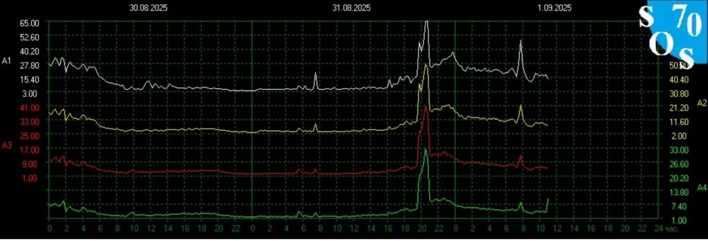 Op maandag 1-9 was er activiteit in de nacht tussen 2:00 en 15:00 uur, met een intensiteit van 50 amplitude, dat is ook hoog. De maandag is nog niet voorbij, dus er kan nog meer komen. Als het lukt zal ik de informatie updaten op dinsdagochtend 2-9.