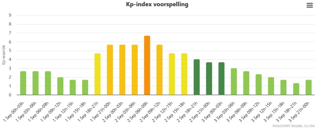 De verwachting is dat de verwachtte zonnestorm van maandagavond 1-9 aankomt op aarde rond 20:00 uur en zijn piek bereikt in de nacht van maandag op dinsdag en op dinsdag met een hoge KP-7. Op woensdag zakt het weer weg naar normaal rond KP-4, een situatie tegen zonnestorm aan. Daarna volgen er nog wat mildere verhogingen van zonnestorm van de C-Klasse zonnevlammen die zondag en maandag richting de aarde zijn gestuwd.