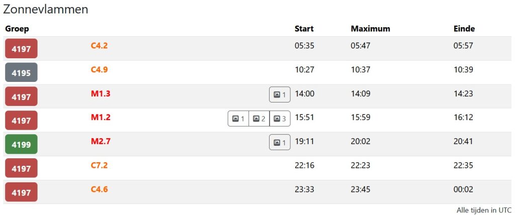 Afb: Dit is zijn de zonnevlammen van maandag 1-9. De 4197 zijn niet hele hoge zonnevlammen, maar wel aarde gericht en voldoende om weer opnieuw protonen richting de aarde te sturen die op maandagochtend weer opliepen hierdoor en zonnestorm die vanaf woensdag 3-9 weer aankomen op aarde (milde kp-5 waarschijnlijk).