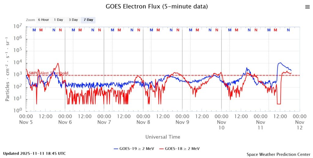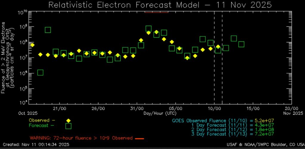 KORTE UITLEG: Vanaf 8-11 zijn de elektronen in de ionensfeer van de aarde hoog, tegen elektronenstorm aan. Vanaf 11-11 rond 11 uur kwamen de elektronen in stormlevel.