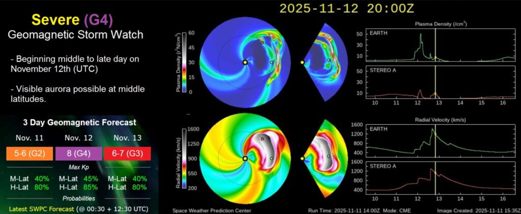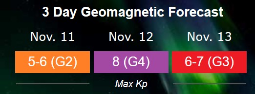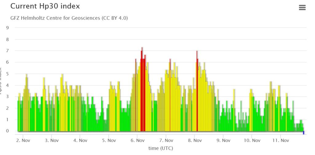 Afb: Dit is de Hp-index van de afgelopen week die zonnestormen laat zien. Dit is de reactie van de magnetosfeer van de aarde op de zonnewind. We zien op 11-11 nog geen zonnestormen, alleen een milde situatie tegen zonnestorm aan. Maar de verwachting is dat er een grote zonnestorm gaat komen op woensdag 12-11 kp-8 een G4 zonnestorm.