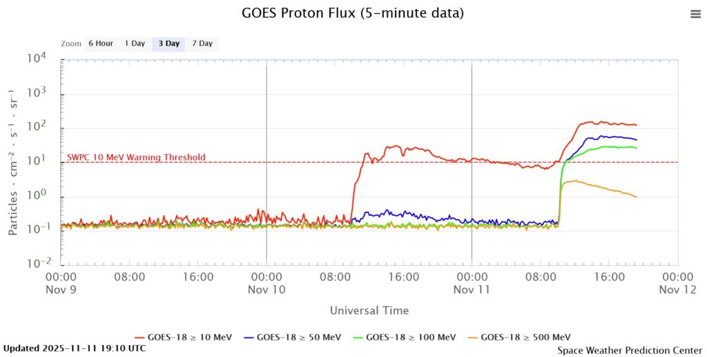 Afb: Dit zijn de protonen die op maandag 10-11 al opliepen naar stormlevel door de X-1.2 zonnevlam van 9:00 uur Europese tijd van dezelfde zonnevlek als de grote zonnevlam van 11-11 om 11 uur. Door de hoge X-5.16 zonnevlam van 11-11 om 11 uur liep protonenstorm nog verder op naar zeer hoog. Misschien was je al ziek, want deze protonenstormen zijn fikse reinigers. Ook slapen is door de hoge frequentie niet altijd eenvoudig tijdens een protonenstorm.