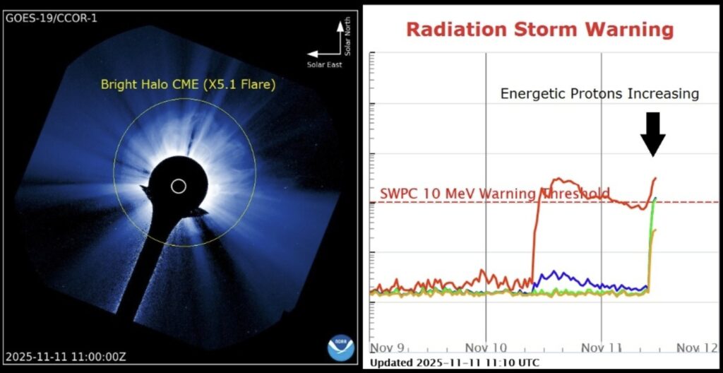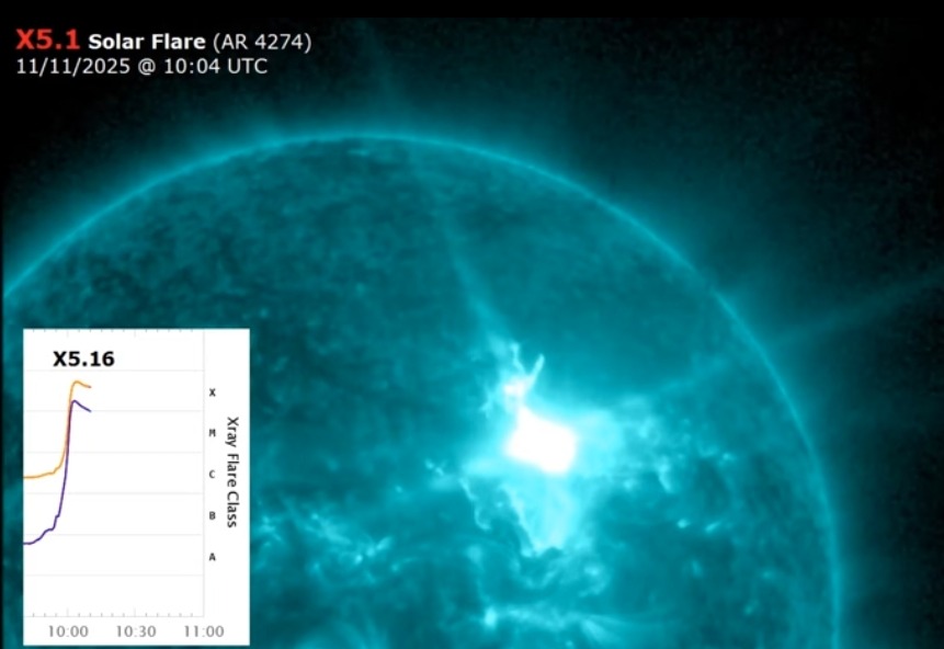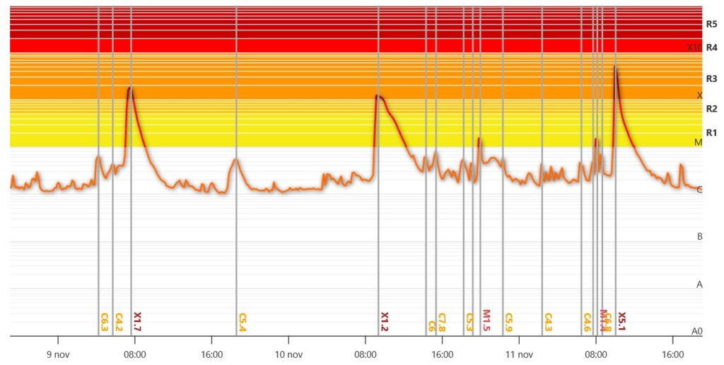 Afb: Dit zijn de zonnestormen van maandag 10-11 en dinsdag 11-11 en waar die grote X-5.16 dus bij zat die de zonnestorm onze richting op stuwt.