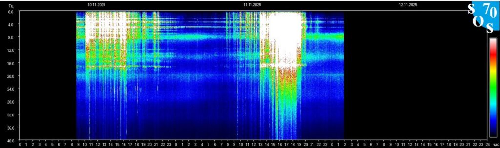 KORTE UITLEG ACTUELE SITUATIE: De Schumannresonantie activiteit was mild verhoogd op maandag tussen 5:00 en 12:00 uur met een intensiteit van 23 amplitude, dus mild. Op dinsdag 11-11 zien we SR activiteit tussen 8:00 en 15:00 uur met een intensiteit van maximaal 43 amplitude en dat is een hoge activiteit. SR geeft de meeste symptomen als er ook andere verstoringen zijn en die waren er met de grote zonnevlam rond die tijd, dus deze SR was zeker wel goed voelbaar.