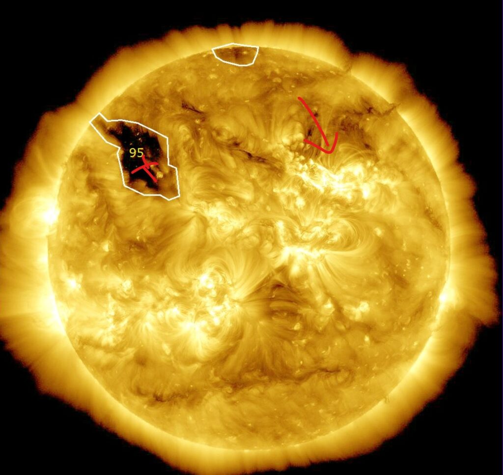 Afb: De rode pijl wijst naar de grote complexe zonnevlam die de grote zonnevlammen produceerde. Het rode kruisje staat in een flink gat in de corona, die zonnewind richting de aarde spuwt.