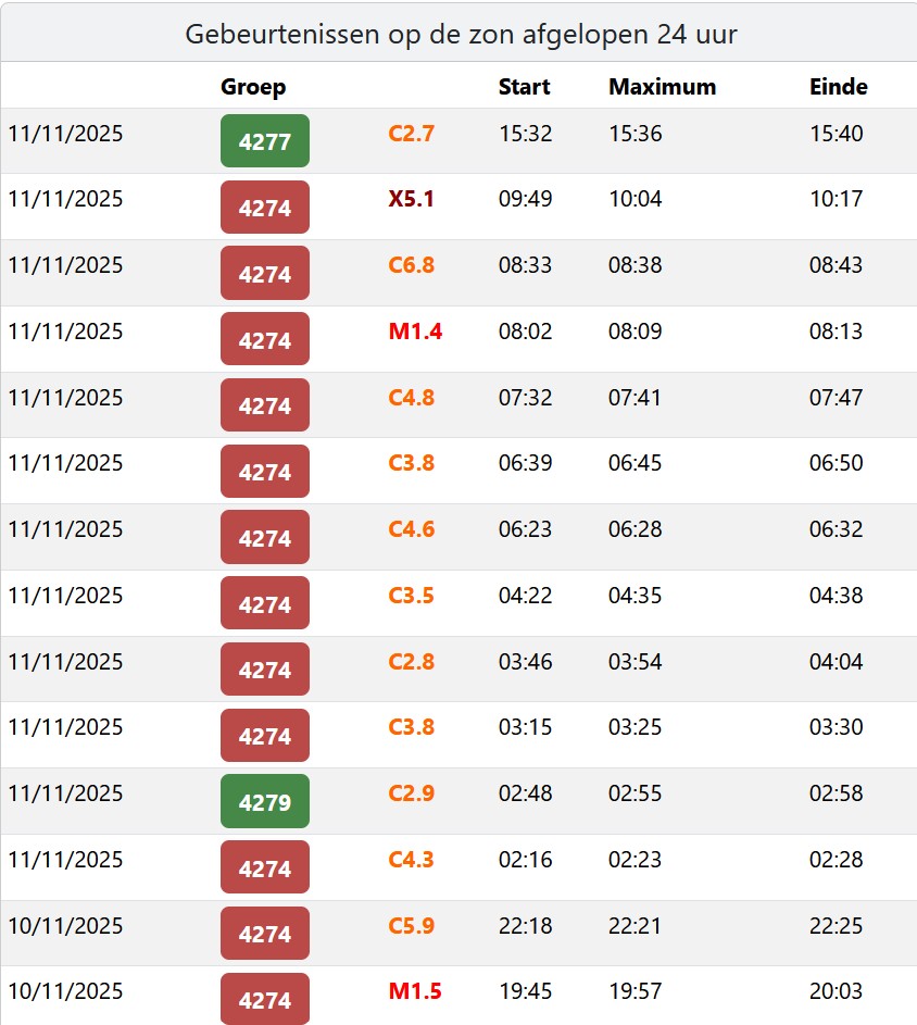 De actieve zonnevlek die de afgelopen dagen de hoge zonnevlammen produceerde is alleen woensdag nog op de aarde gericht en vanaf zaterdag 15-11 verdwijnt deze zonnevlek weer naar de achterkant van de Zon. Omdat het zo’n complexe magnetische zonnevlek is, kan deze tot het moment waarop de zonnevlek naar de achterkant van de Zon verhuist nog steeds grote zonnevlammen en zonnestormen veroorzaken. Er is een grote zonnestorm onderweg naar de aarde veroorzaakt door de grote X-5,3 zonnevlam. Lees daarover meer bij de Zonnestormen hieronder.