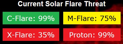 Afb: Er is een zeer hoge verwachting voor hoge M-klasse zonnevlammen 75% en 35% X-klasse zonnevlammen. Dat is erg hoog. De protonen zijn extra hoog geactiveerd en dat gaat langzaam zakken de komende 5 dagen. Lees meer over de protonen hieronder bij de zonnestormen.