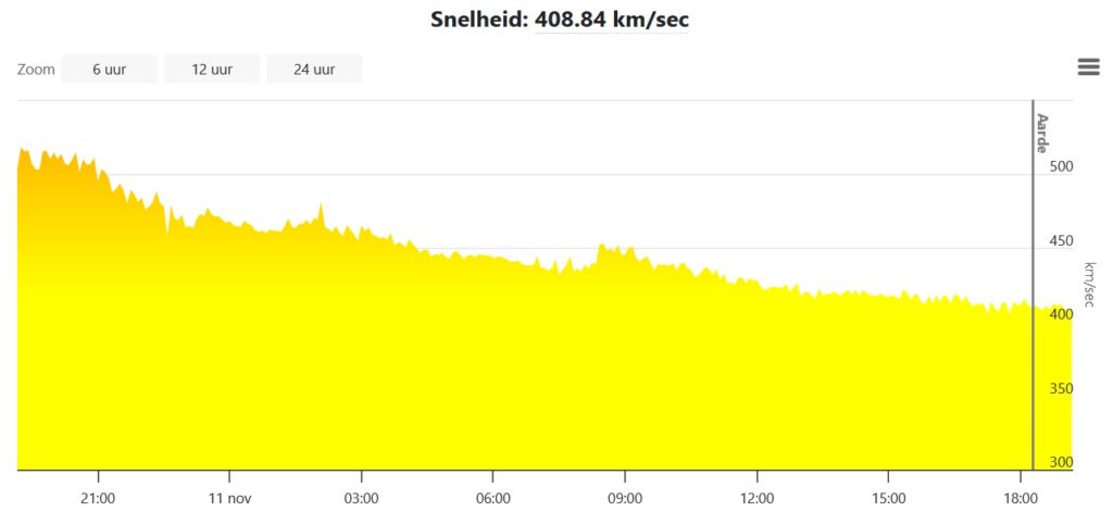 Afb: Dit is de zonnewind snelheid. Ook die is niet verhoogd op dinsdag 11-11, maar gaat oplopen wanneer de zonnestormen binnen gaan komen op dinsdag. Jaaa, meerdere zonnestormen die samenkomen en dus extreme situaties kunnen veroorzaken. Dan loopt de zonnewind snelheid op naar 700-800 km/sec is mijn verwachting en dat blijft dan wat langer hoog. Dus je blijft dan de hele week tot maandag nog wel symptomen ervaren van verhoogde zonnewind snelheid, tot dat die weer normaal is rond de 400 km/sec. Het kan ook allemaal erg meevallen. Maar de zonnewind snelheid gaat wel oplopen, dat is zeker.