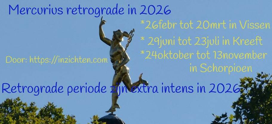 De Mercurius retrograde perioden in 2026 zijn extra intens. Dit komt omdat het overlevingsmechanisme dat een groot deel van 2026 actief is, in Tweelingen staat en die wordt geregeerd door Mercurius. De meeste mensen leven vanuit het overlevingsmechanisme in Tweelingen en dat gaat in een groot deel van 2026 over overweldigende hoeveelheid informatie en communicatie, geen focus hebben (all over the place zijn), fragmentatie, strijd en uit elkaar vallen van verbindingen, oppervlakkigheid, niet geaard zijn (zweven), te veel denken en piekeren, vluchten in spelletjes en onvolwassen gedrag, maar ook reizen en zuiverheid van informatie en communicatie kan ver te zoeken zijn. Tijdens de retrograde periode dwingt Mercurius je naar binnen te gaan en met JEZELF te communiceren. Als die weg naar binnen te moeilijk is, dan ontstaat er heel veel spanning en gaat men zoeken naar afleiding. Een manier om te zakken en spanning kwijt te raken kan worden gezocht in beweging, humor, spelen (innerlijk kind), zingeving, religie, cultuur, communicatie met hogere dimensies of mogelijk ook andere niet aardse rassen (channelen, weten). Ook zullen verkeer, reizen, informatie, info-overdracht, communicatie en computers/technologie sowieso al extra pittige problemen ondervinden tijdens de periode waarin De Bronstroom in Boogschutter staat (zie onderaan deze alinea voor data). Tijdens de retrograde periode moet je ook naar jezelf gaan kijken. Het positieve is dat als je naar binnen gaat en intern gaat bekijken wat jouw bijdrage is in het geheel, het Licht je draagt en er enorme krachtige en supersnelle oplossingen kunnen komen. Dit geldt ook voor bedrijven en (politieke)systemen in onze wereld. (De zwarte Maan staat in 2026 Boogschutter en dus het overlevingsmechanisme staat dan in Tweelingen en dan zijn de retrograde periode heftiger. Gecorrigeerde zwarte Maan in Boogschutter: 29-11 tot 20-3-2026 & 9-4 tot 13-7-2026 & 27-9 tot 29-11-2026. Ware zwarte Maan in Boogschutter 21-12- tot 16-9-2026.)