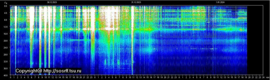KORTE UITLEG VAN DE VERSTORINGEN: Er was op zaterdag 30-12 een hoge Schumannresonantie activiteit tussen 23:00 en 7:00 uur, met de hoogste piek rond de 62 amplitude. Omdat de SR een week offline was, kon ik dit niet weergeven.