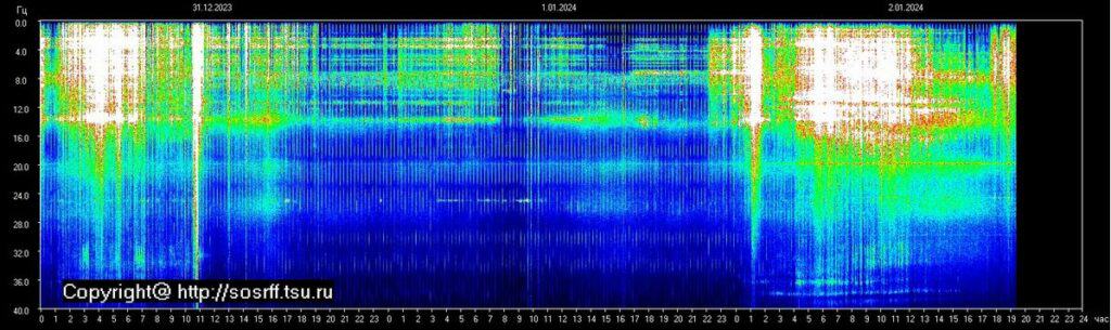 Ab: Dit is de Schumannresonantie met de amplitude en die ging maandagavond 1-1-2024 rond 19:00 uur naar de 32 amplitude (A1), zie rode pijl. en komt dan weer terug rond de basis rond 7,8. Maar amplitude is niet hetzelfde als de frequentie. En zoals je ziet blijft de SR niet op het niveau van 32, maar keert terug naar de basis.