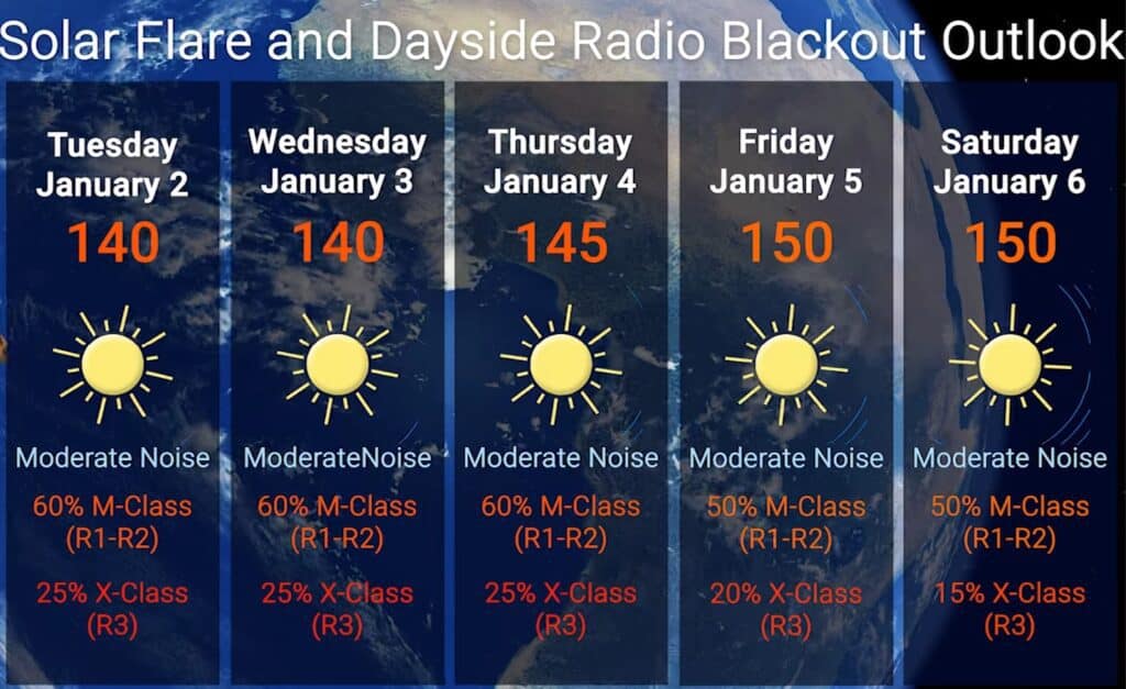 Afb: De dreiging voor zonnevlammen voor maandag 1-1-2024. Door de nieuwe (terugkerende) zonnevlekken op de rand van de Zon is er een ZEER HOGE ZONNEVLAM ALERT. Dus maak de riemen maar vast.