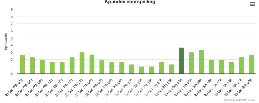 Afb: dit is de weergave van de Kp-index en dat is de reactie van de beschermende magnetosfeer van de aarde op zonnewind en andere kosmische invloeden.