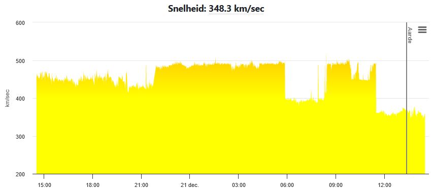 Afb: dit is de weergave van de zonnewind snelheid. Tijd + 1 uur voor onze tijd.