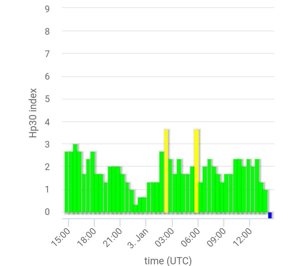 Afb: dit is de weergave van de Kp-index en dat is de reactie van de beschermende magnetosfeer van de aarde op zonnewind en andere kosmische invloeden.