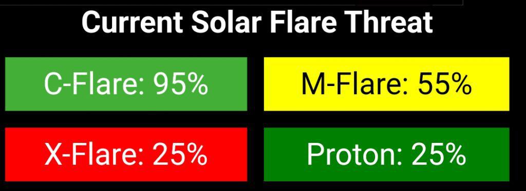 Afb: De dreiging voor zonnevlammen voor maandag 1-1-2024 & dinsdag 2-1. Door de nieuwe (terugkerende) zonnevlekken op de rand van de Zon is er een ZEER HOGE ZONNEVLAM ALERT. Dus maak de riemen maar vast.