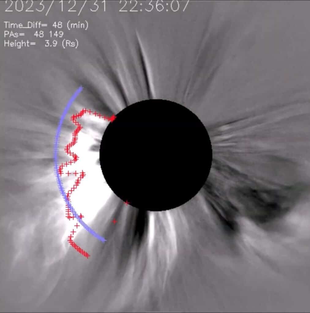 KORT UITLEG ACTUELE SITUATIE ZONNEWIND: Het is rustig met de zonnewind. De komende 2 dagen wordt er een milde verhoging van de zonnewind verwacht die vanuit het grote gat in de corona is gestroomd naar de aarde toe. En er is een CME onderweg die door de hele grote zonnevlam X-5.01 op oude jaarsavond rond 22:50 uur op zijn piek was. Die impact kunnen we zeer waarschijnlijk wel met een zonnestorm rond kp-5, misschien nog hoger. Maar omdat deze blast vanaf de rand van de Zon kwam is het niet waarschijnlijk dat het een hogere zonnestorm zal geven. De impact van de grote X-5 zonnevlam zal op dinsdag. Ik persoonlijk verwacht de impact pas rond dinsdagavond/nacht of woensdag.