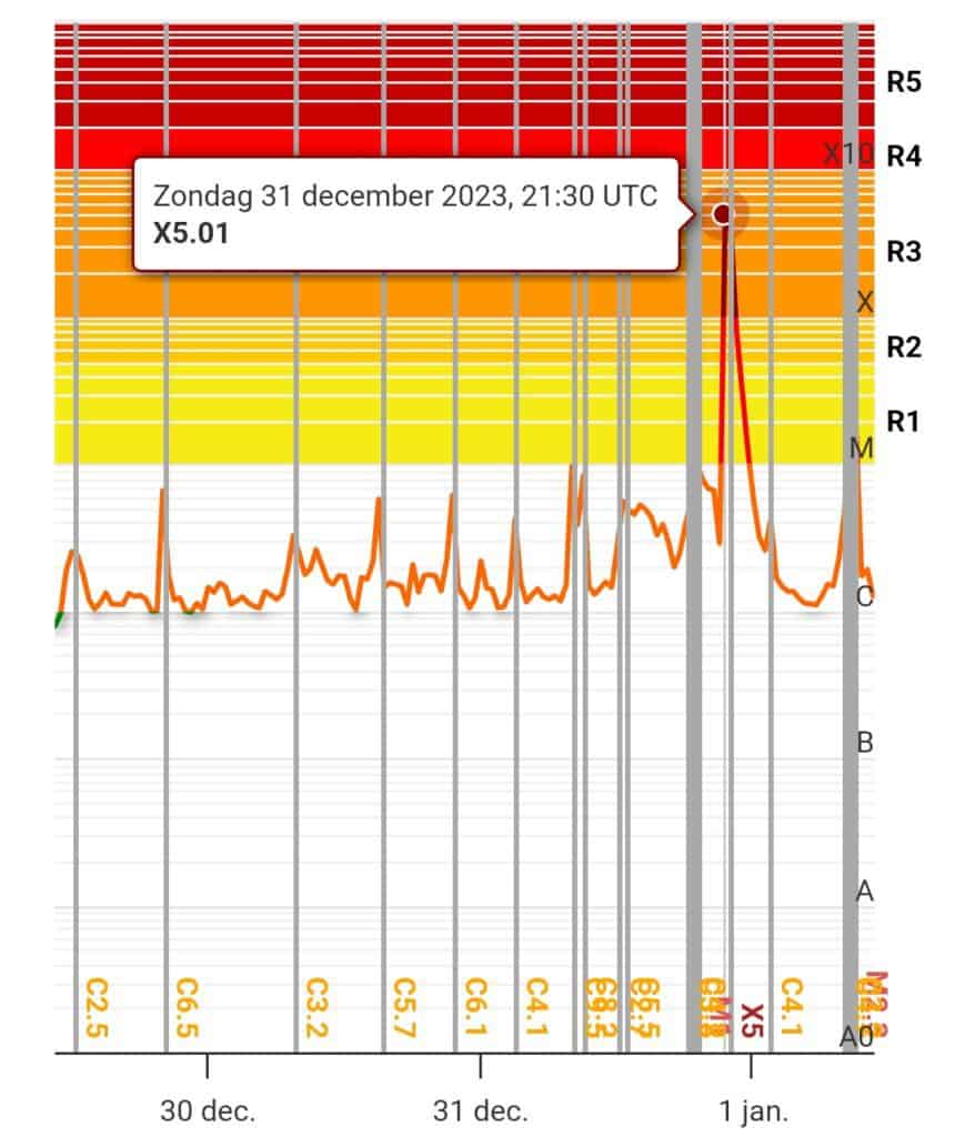 Afb: dit is de weergave van de extreem hoge X-ray zonnevlammen van zondagavond oudjaarsavond rond 22:50 uur. Dit is de hoogste zonnevlam van deze cyclus 25 en de hoogste sinds die heftige zonnevlammen in het najaar van 2017. Die zonnevlammen hadden toen een mega impact in de bewustzijnsgroei. Ik voelde de opbouw van de zonnevlam al komen de hele dag ervoor en de verhoging van de trilling erbij in het lichaam en het zenuwstelsel. Dat was knap pittig met hoofdpijn en toename van licht in de hersenen en het hele zenuwstelsel. Misschien heb jij ook die symptomen ervaren?
