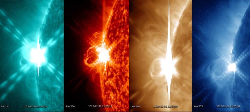 Afb: De grote X-5.01 zonnevlam in verschillende frequentie weergave. Die kwam dus vanaf de rand van de Zon, van een terugkerende zonnevlek die toen deze op de aarde gericht stond ook al heftige zonnevlammen produceerde en nog steeds nu terugkerende aan onze kant van de Zon heel krachtig is.